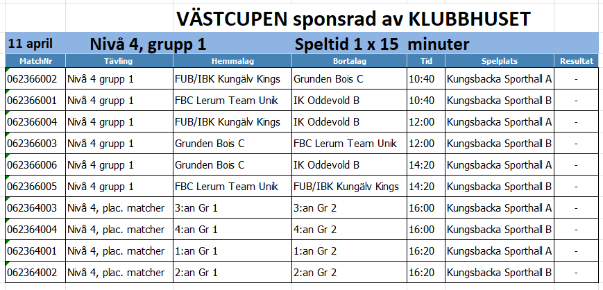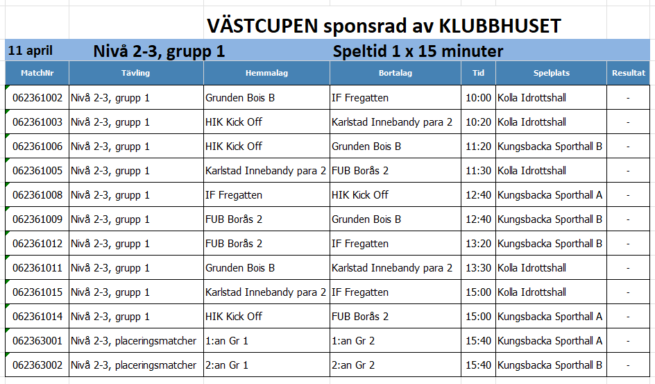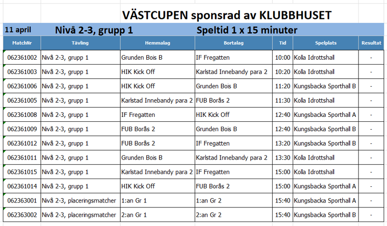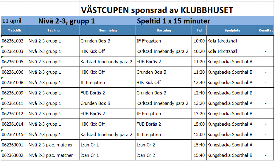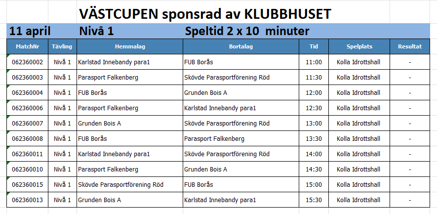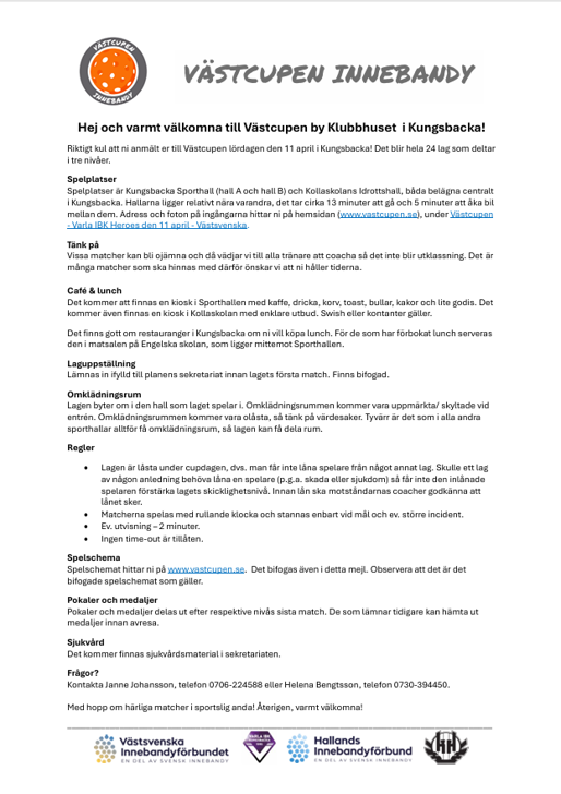 Beställning av spagetti och köttfärssås görs senast den 1 april till madeleine.backstrom@innebandy.se. Glöm inte att ange antal portioner samt ev. specialkost. Pris per portion 100 kr, betalas till Varla IBK: s bankgiro nr: 344-9444, ange Västcupen, lag samt antal luncher.