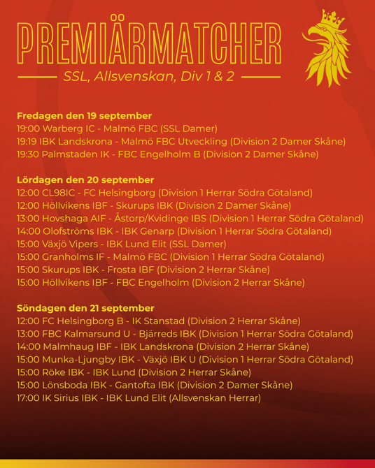 Med start på fredagen drar säsongens första seriematcher igång. Först ut ur Malmö FBC som ställs mot Warberg IC på bortaplan i damernas SSL. Under lördagen och söndagen väntar sedan ett fullspäckat schema då flera seriepremiärer väntar.