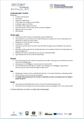 • Laget/klassen ansvarar för sina egna matchkläder och utrustning men det kommer finnas västar för utlåning. Siffror är ej nödvändigt på matchkläderna.