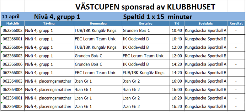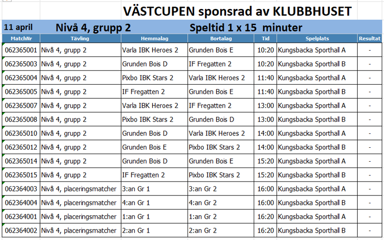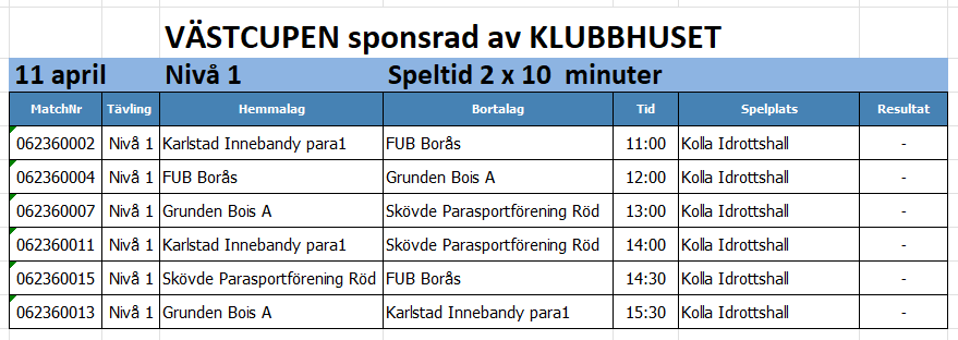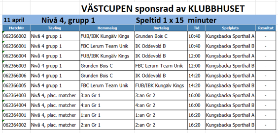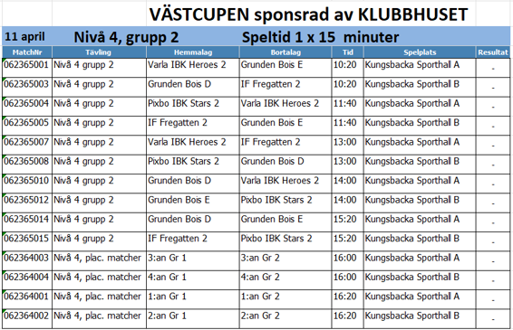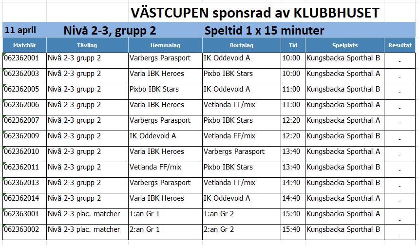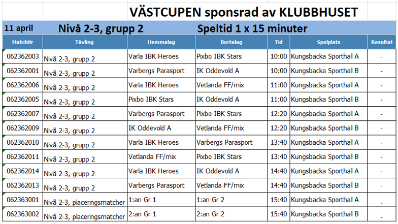 Beställning av spagetti och köttfärssås görs senast den 1 april till madeleine.backstrom@innebandy.se. Glöm inte att ange antal portioner samt ev. specialkost. Pris per portion 100 kr, betalas till Varla IBK: s bankgiro nr: 344-9444, ange Västcupen, lag samt antal luncher.