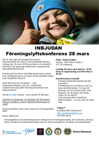 Anmälan görs via länk - Anmälan Föreningslyftkonferens 28 mars 2026. Sista anmälningsdag är den 25 februari. Anmälan är bindande, vid förhinder får föreningen hitta en ersättare, annars debiteras föreningen en avgift.
