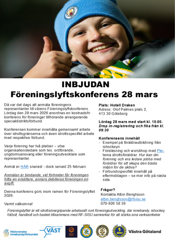 Anmälan görs via länk - Anmälan Föreningslyftkonferens 28 mars 2026. Sista anmälningsdag är den 25 februari.